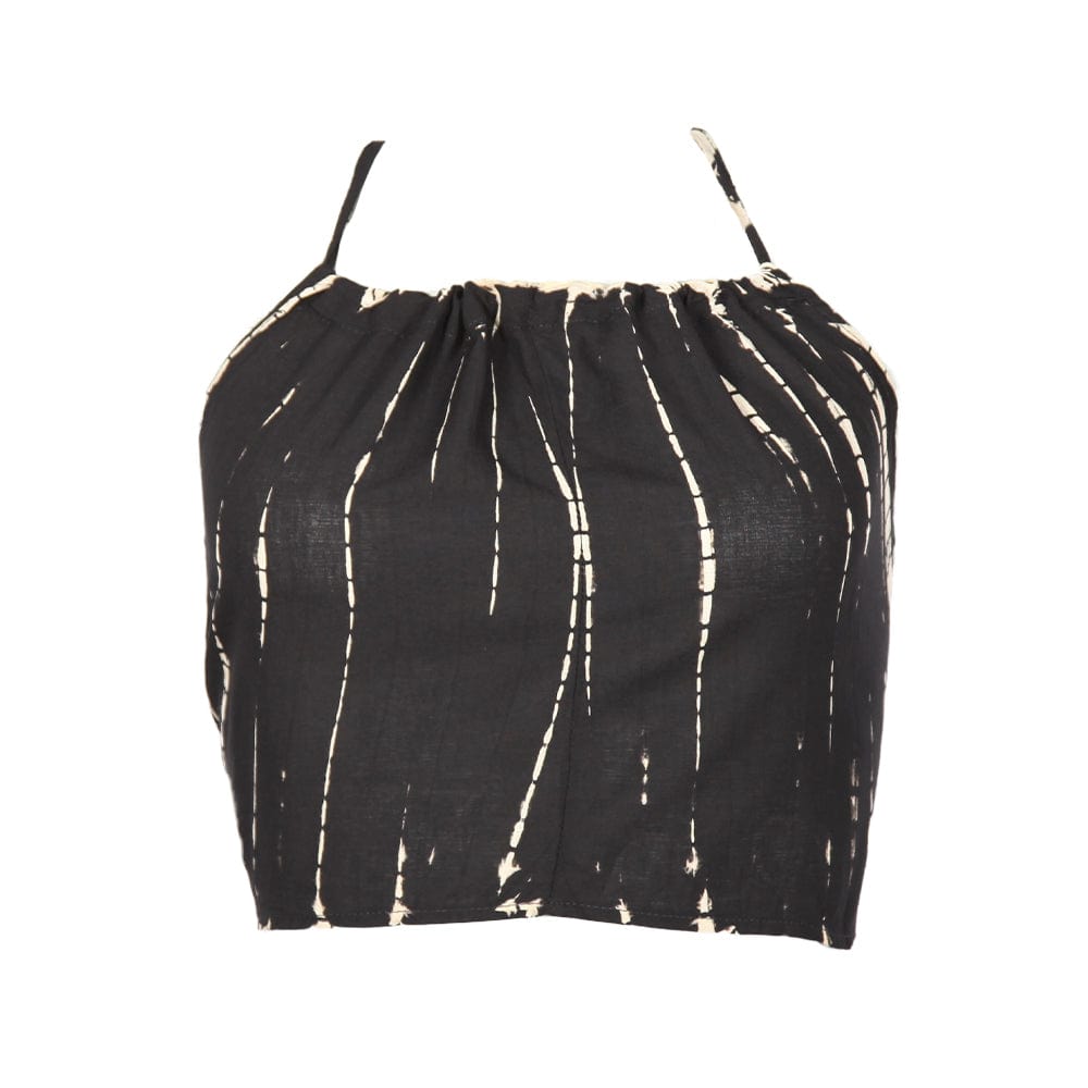 The world wouldn't be anywhere near as colourful without tie dye! This lovely little top celebrates the magic of tie dye in a subtle way with its snakeskin-like patterns. A sweet cropped backless halter neck top, the style is simplicity itself with ties at the back and around the neck. Available in petrol, black, blue, green, grey and white, it's an easy-going wear with your jeans or harems and goes just as well with a flowing long skirt or short hippy skirt.
