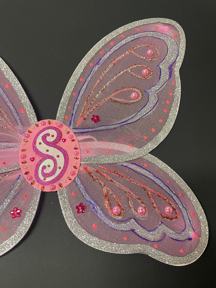 Crafted from lightweight, durable materials, the wings are easy to wear and comfortable for all-day fun. The elegant white fabric features intricate butterfly designs, while the personalized initials add a special, unique touch.