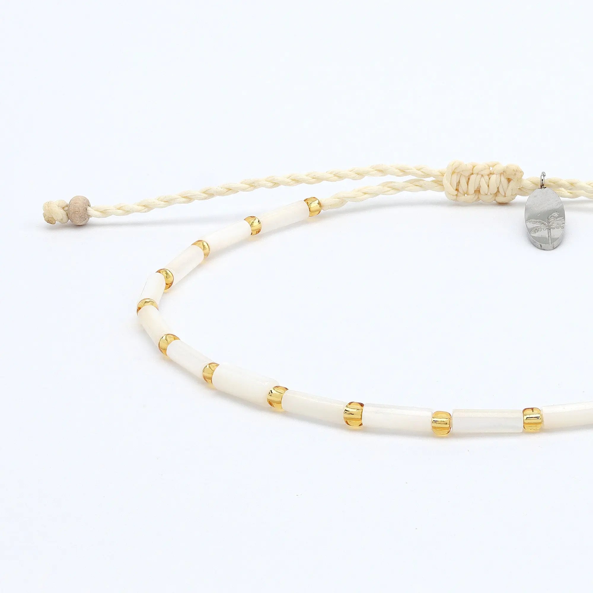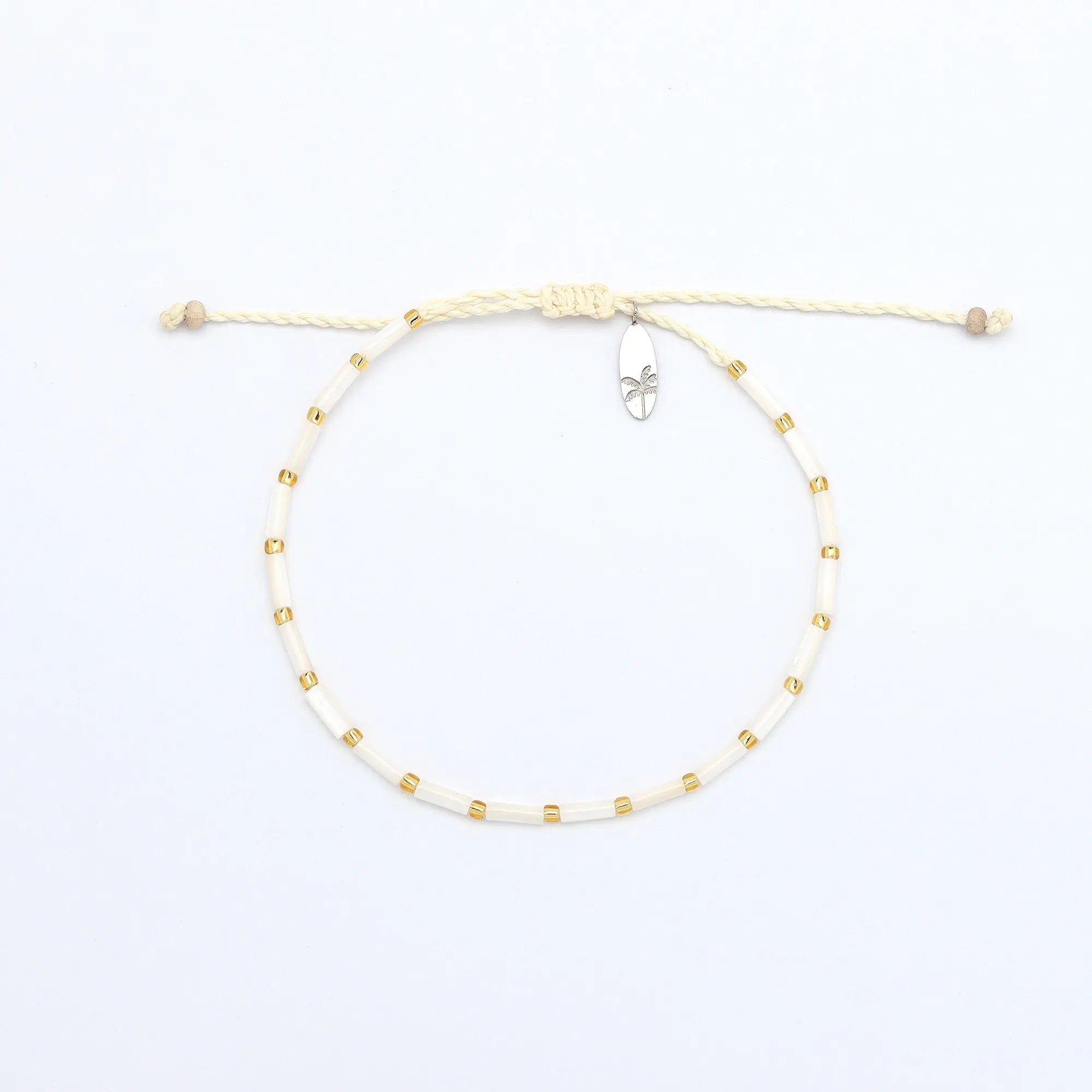 - Made with real mother-of-pearl tube beads, gold-toned glass seed beads, strung on our wax polyester cord and finished with our signature palm tree surfboard charm.