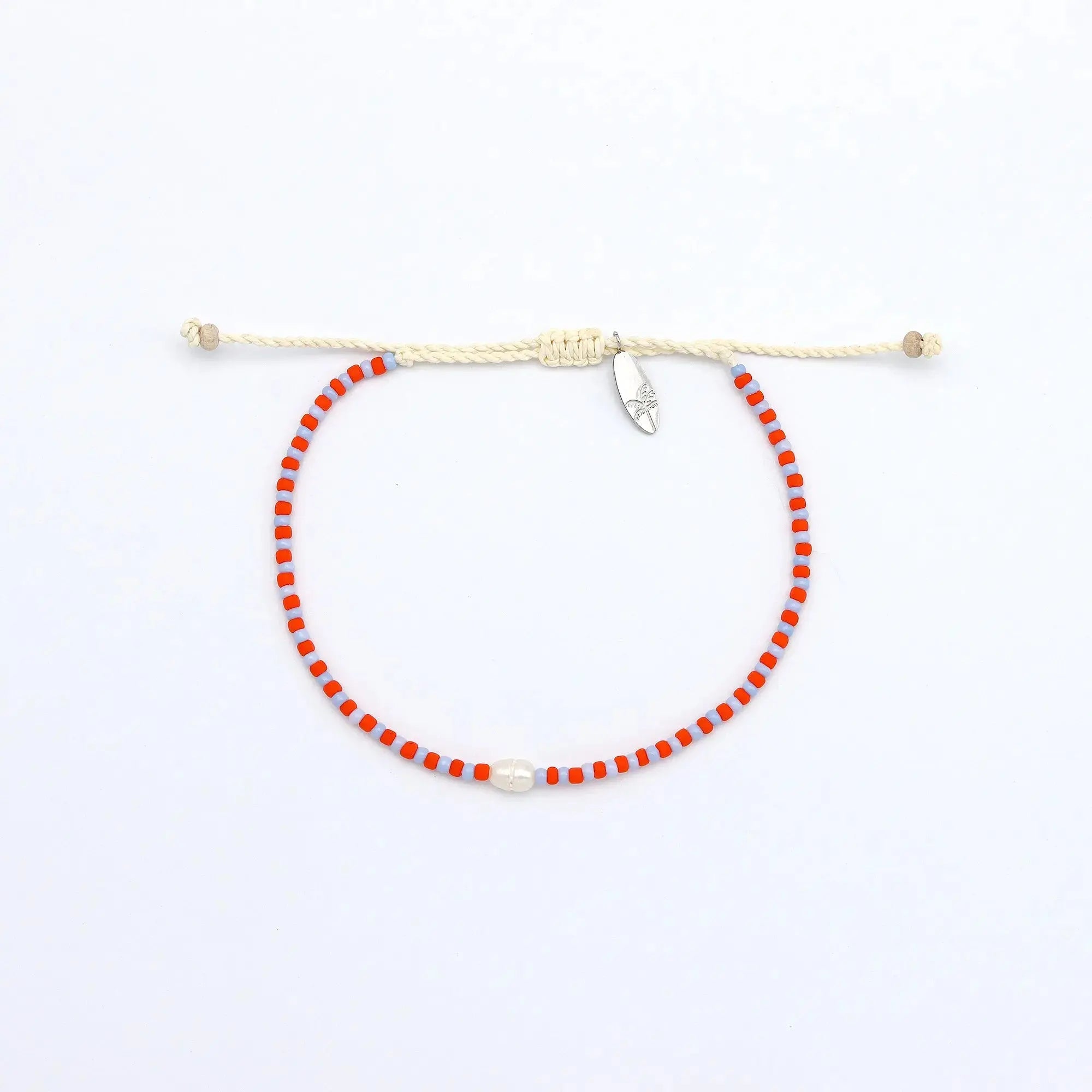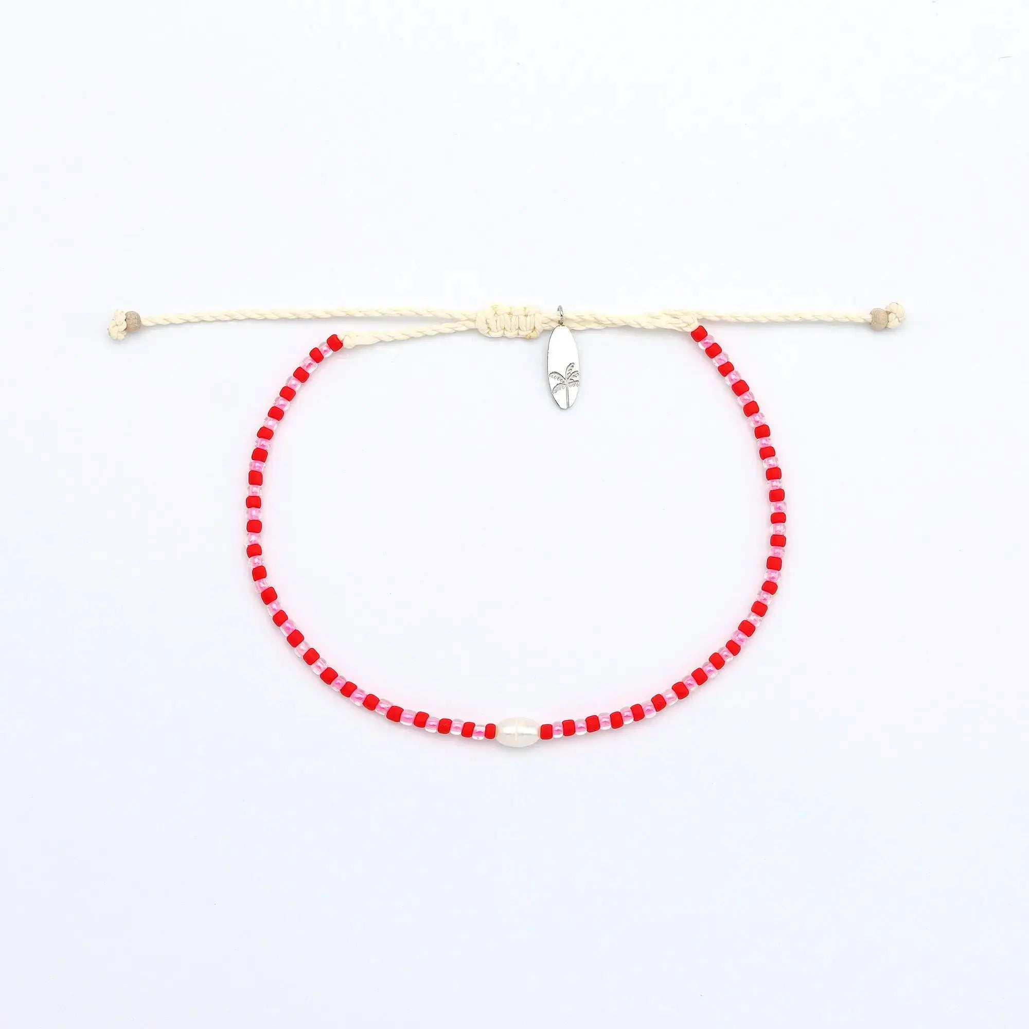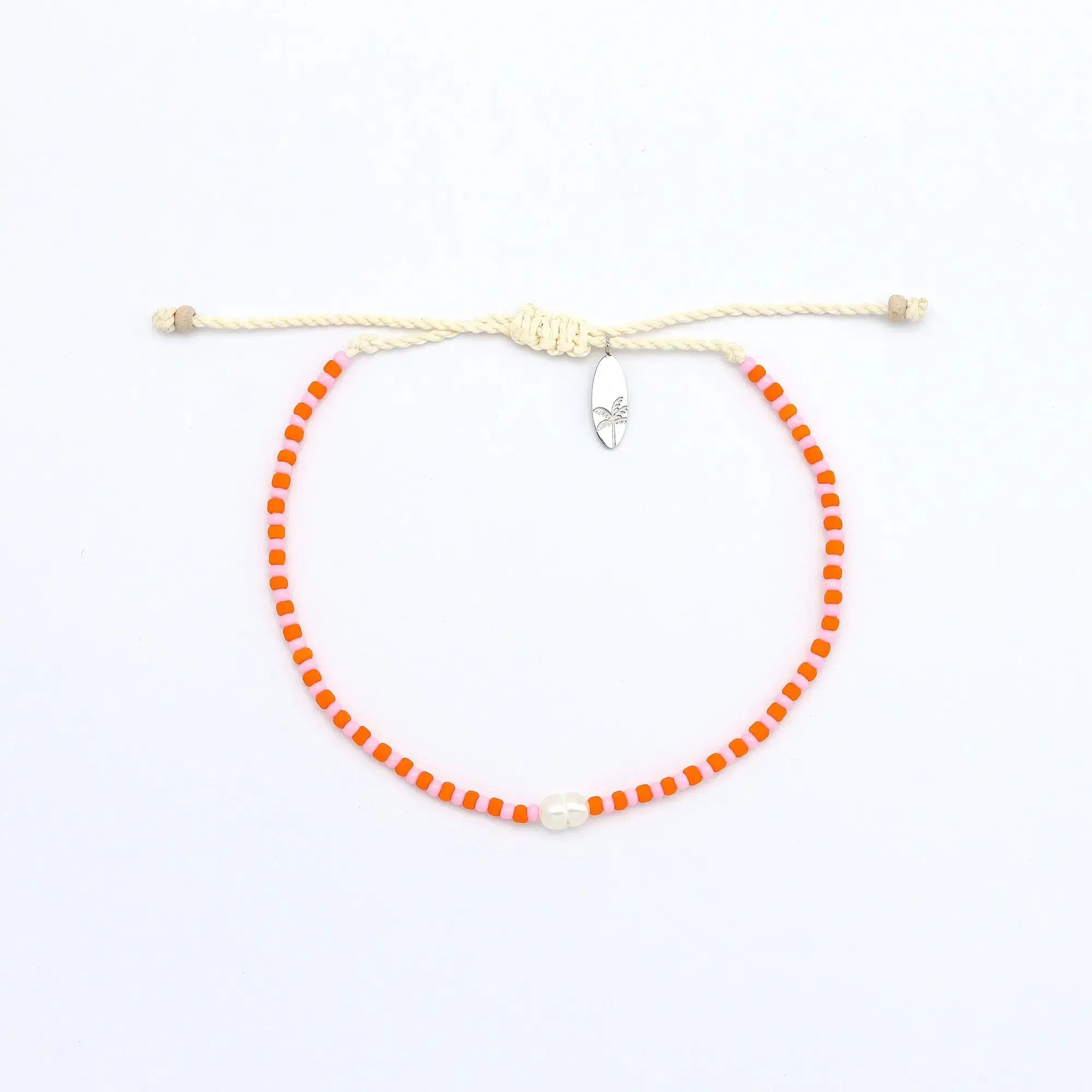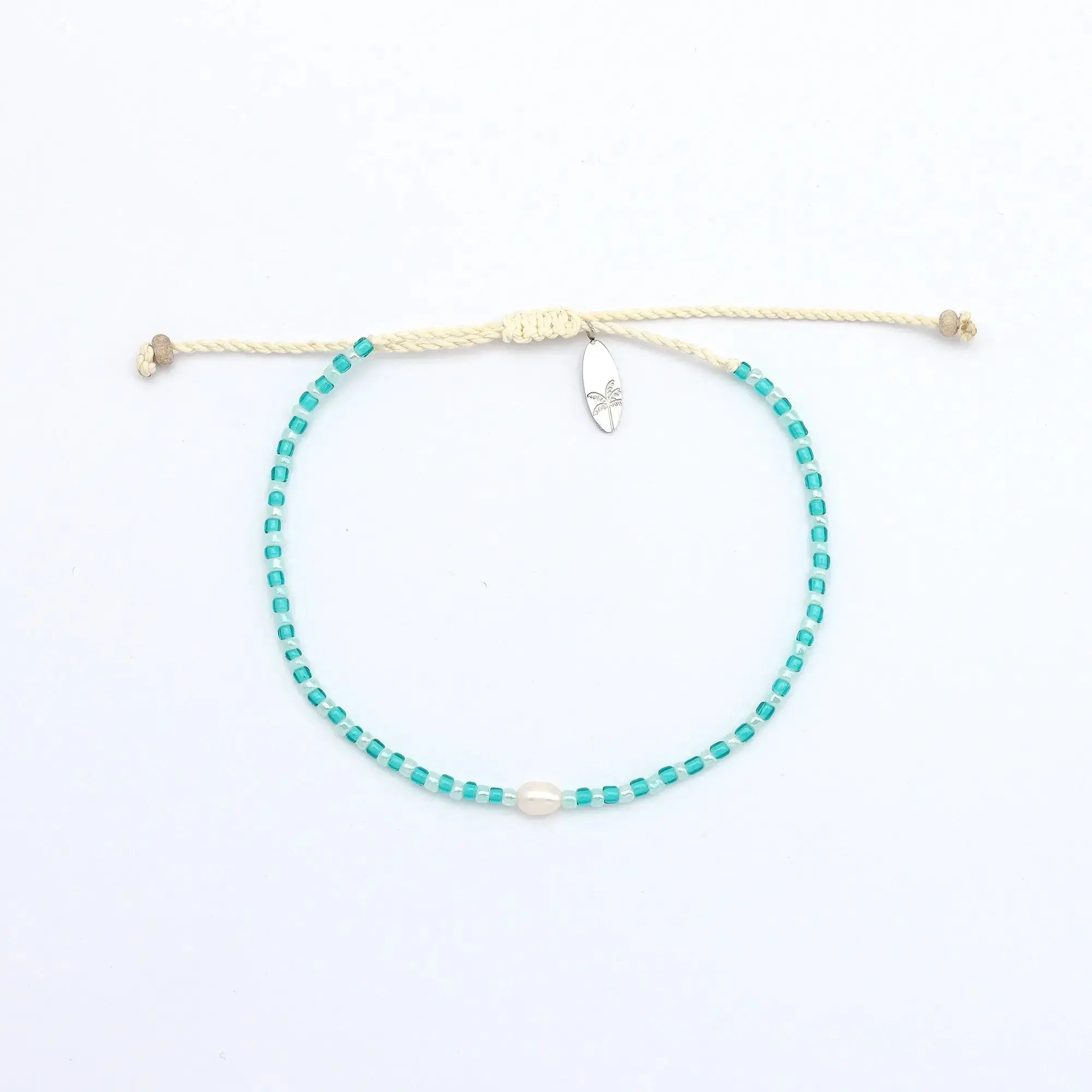 - Made with dainty colourful glass seed beads, centered with a real freshwater pearl, strung on our durable wax polyester and finished with our palm tree surfboard charm.