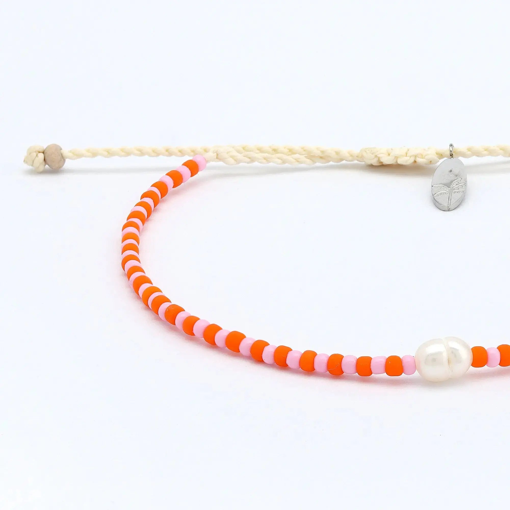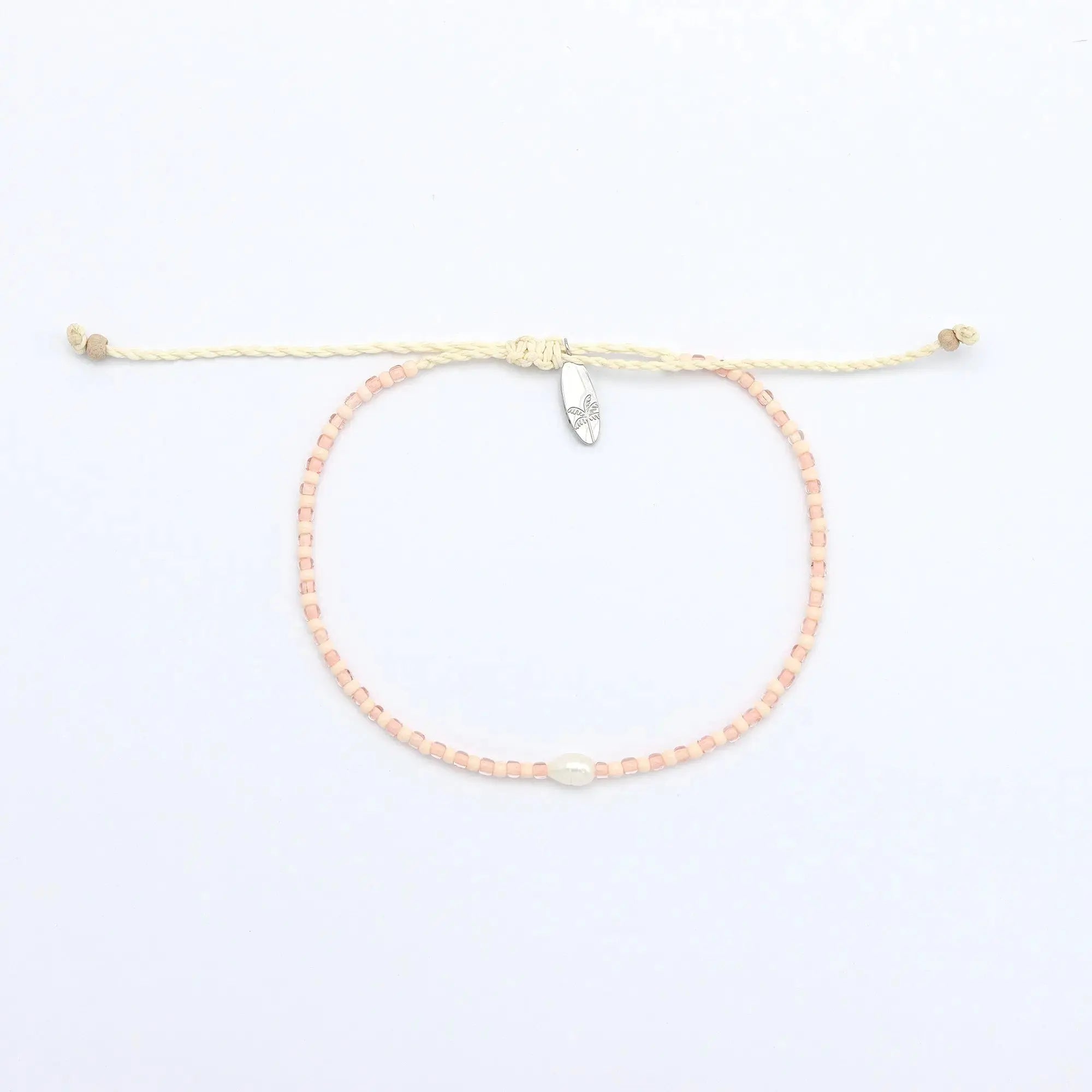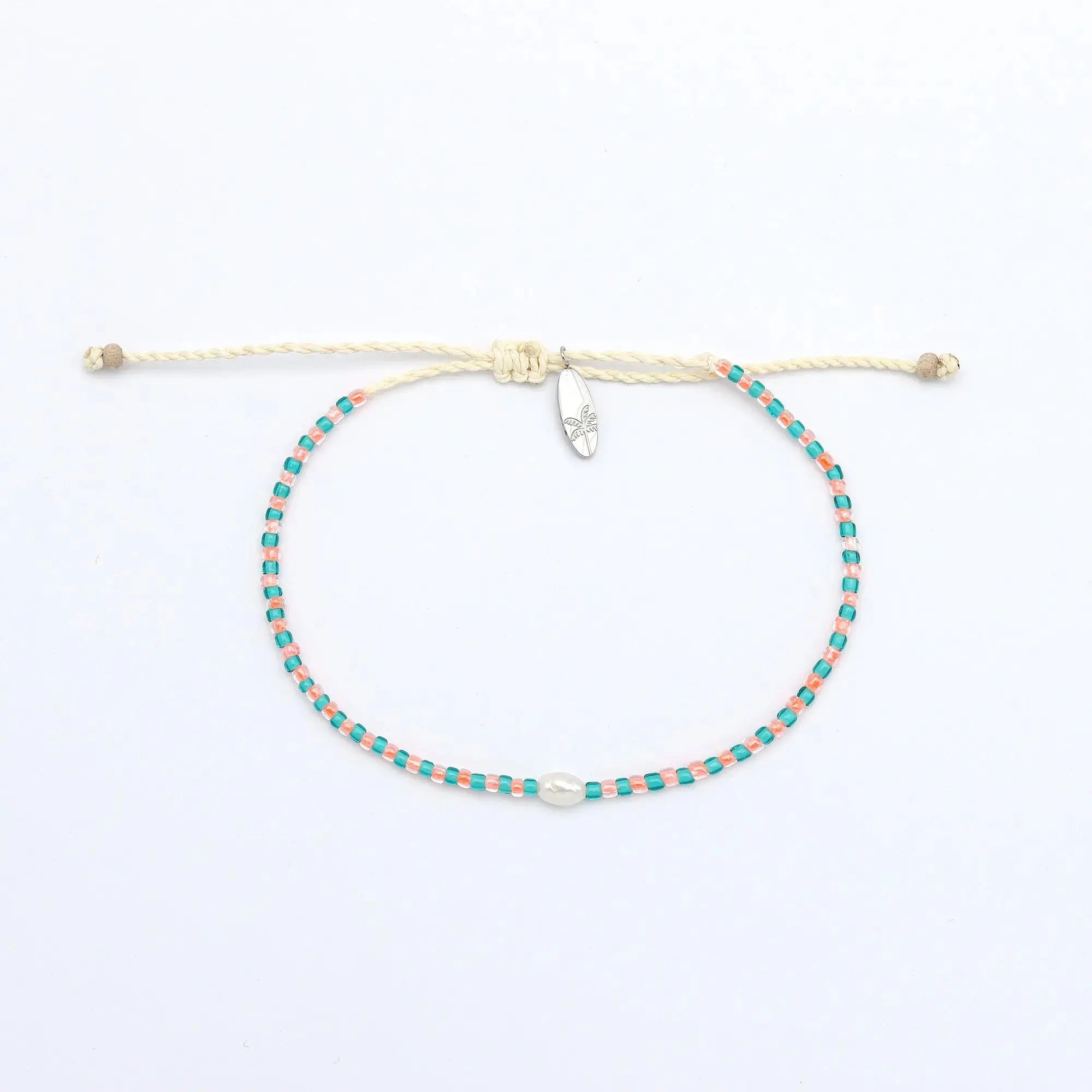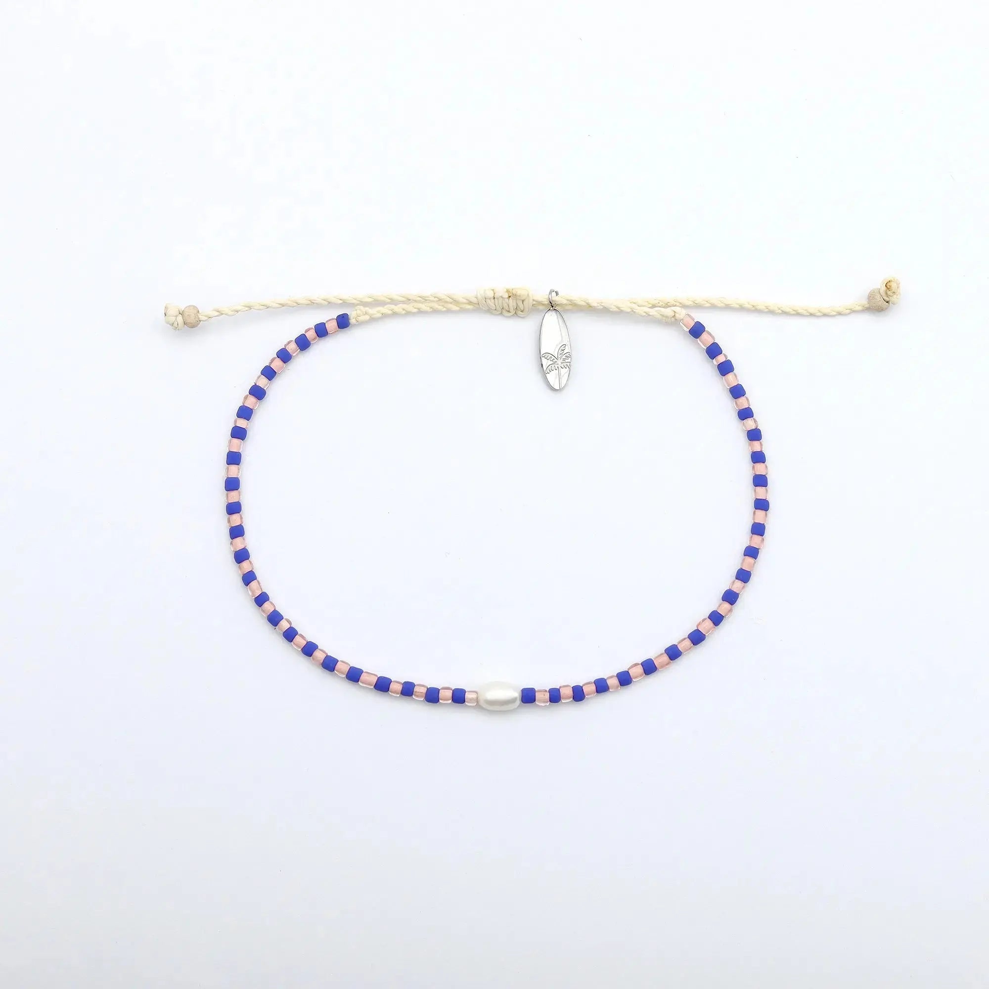 - Made with dainty colourful glass seed beads, centered with a real freshwater pearl, strung on our durable wax polyester and finished with our palm tree surfboard charm.