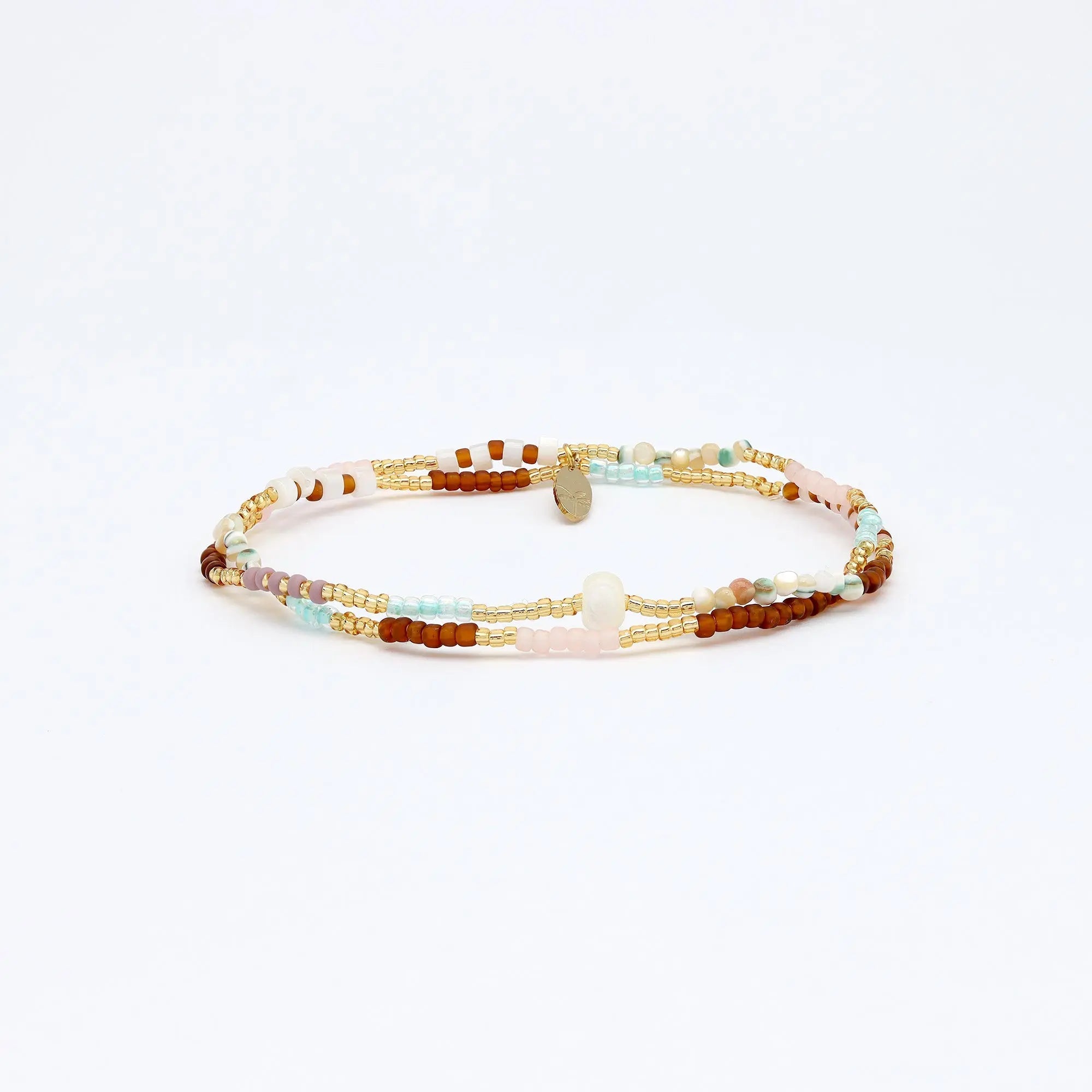 ‘Alam’ means nature in Indonesian, and this bracelet brings all those laid-back, earthy tones together. Made with stretchy cord for an easy, comfy fit, it features a mix of neutral tones with beautiful golden accents, finished with shimmering troca shell.