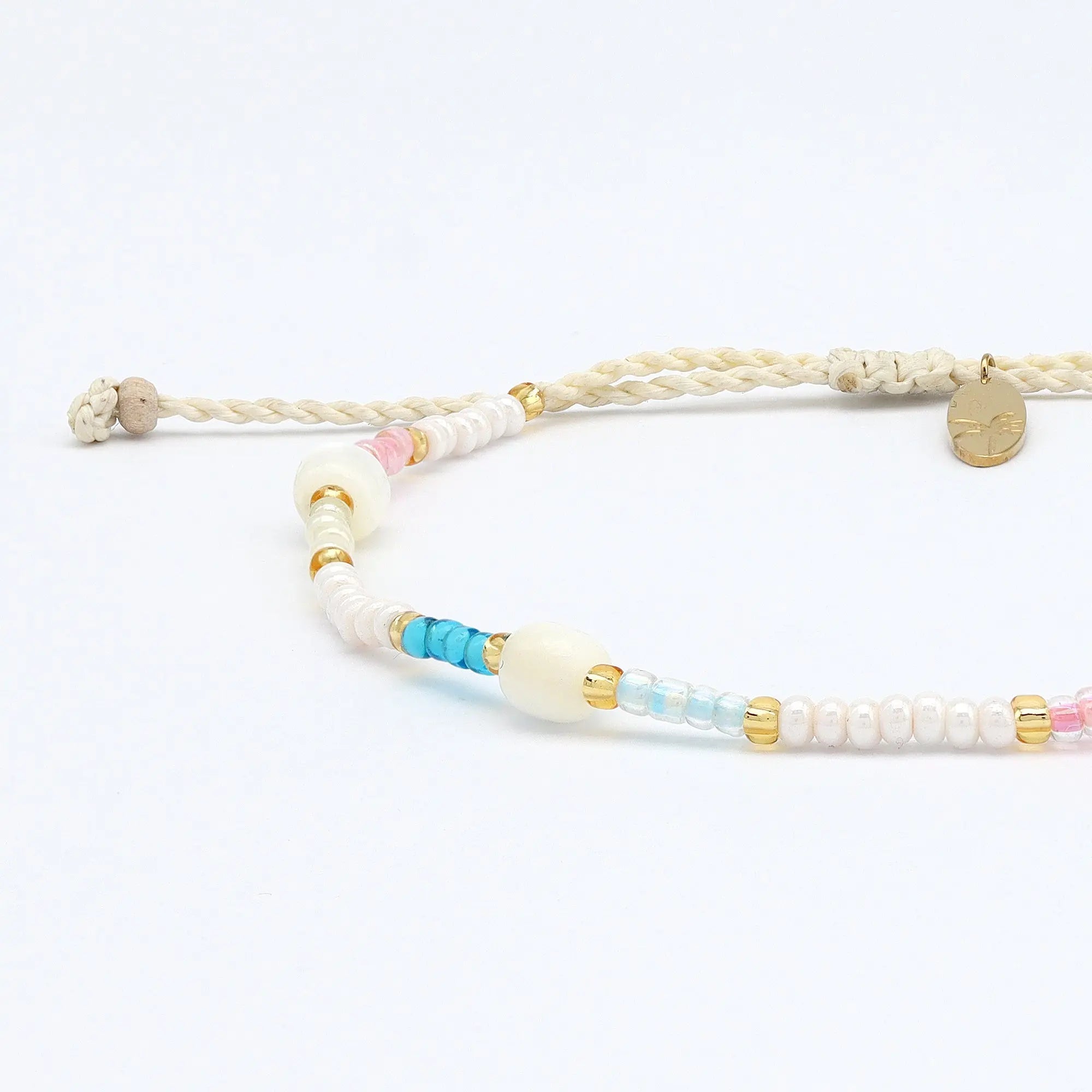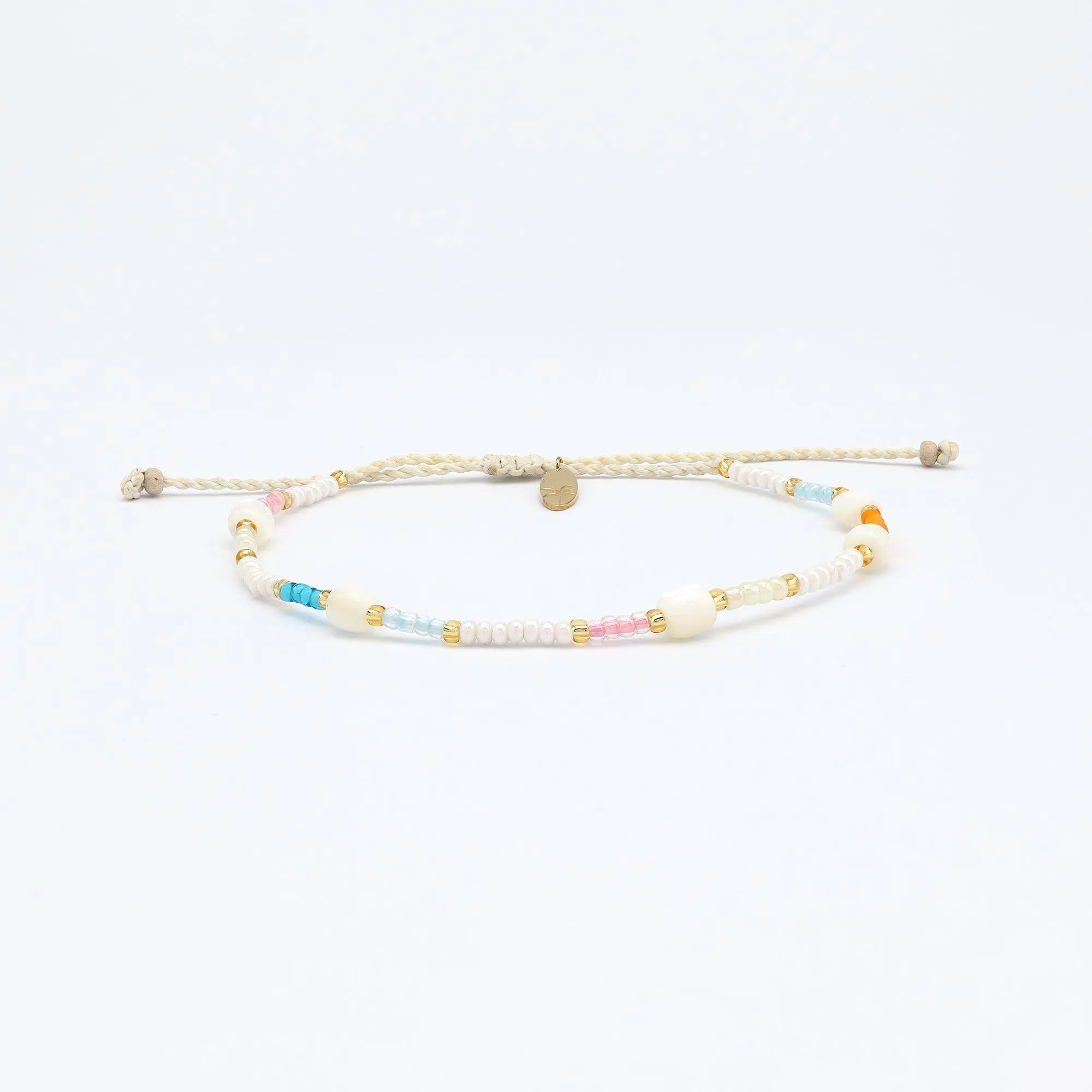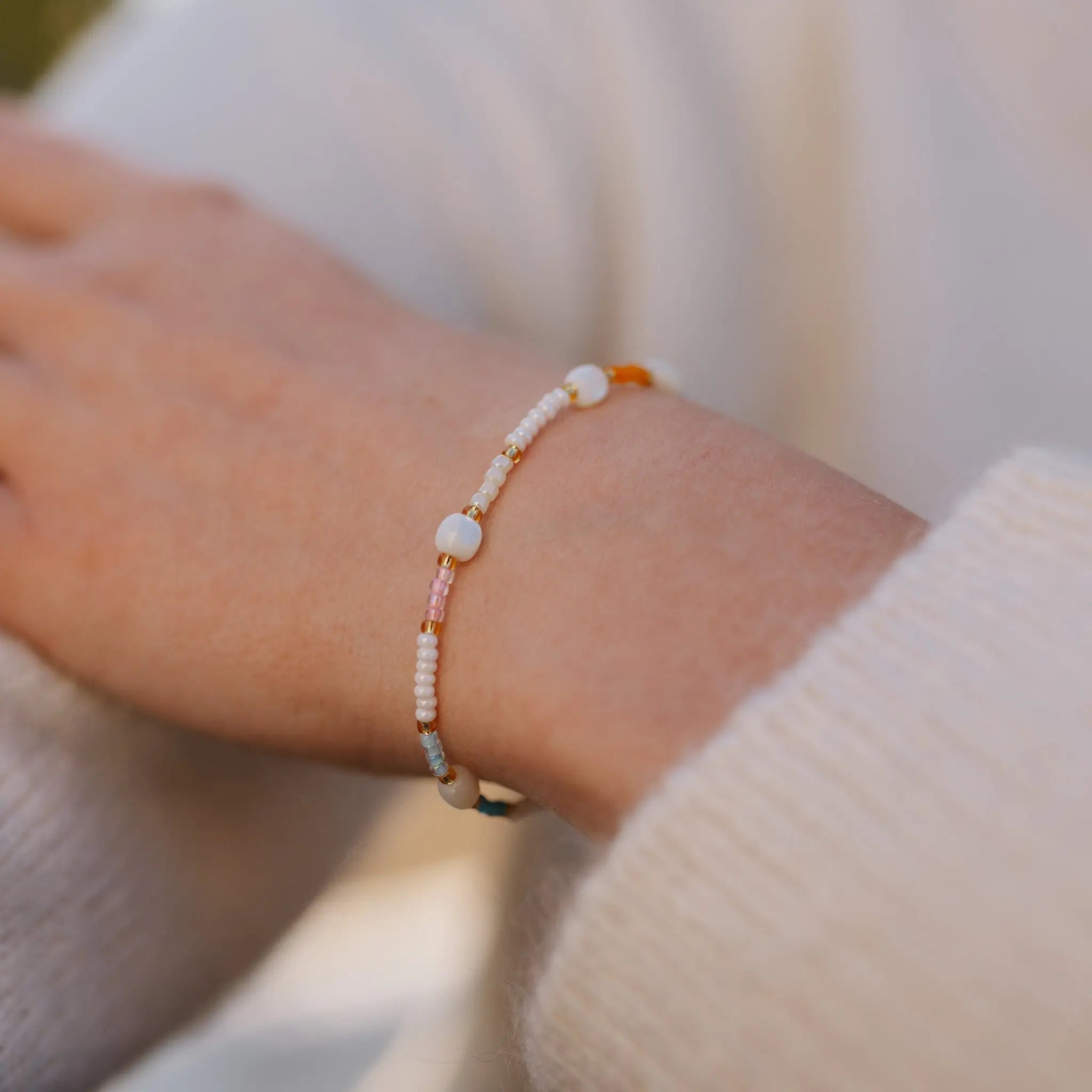 As soft as a late Bali sunrise, the Horison Bracelet captures that calm moment where the sky meets the sea. With a delicate mix of beige, light orange, pink, and blue, and scattered white troca shell beads, this piece brings those horizon hues to your everyday.