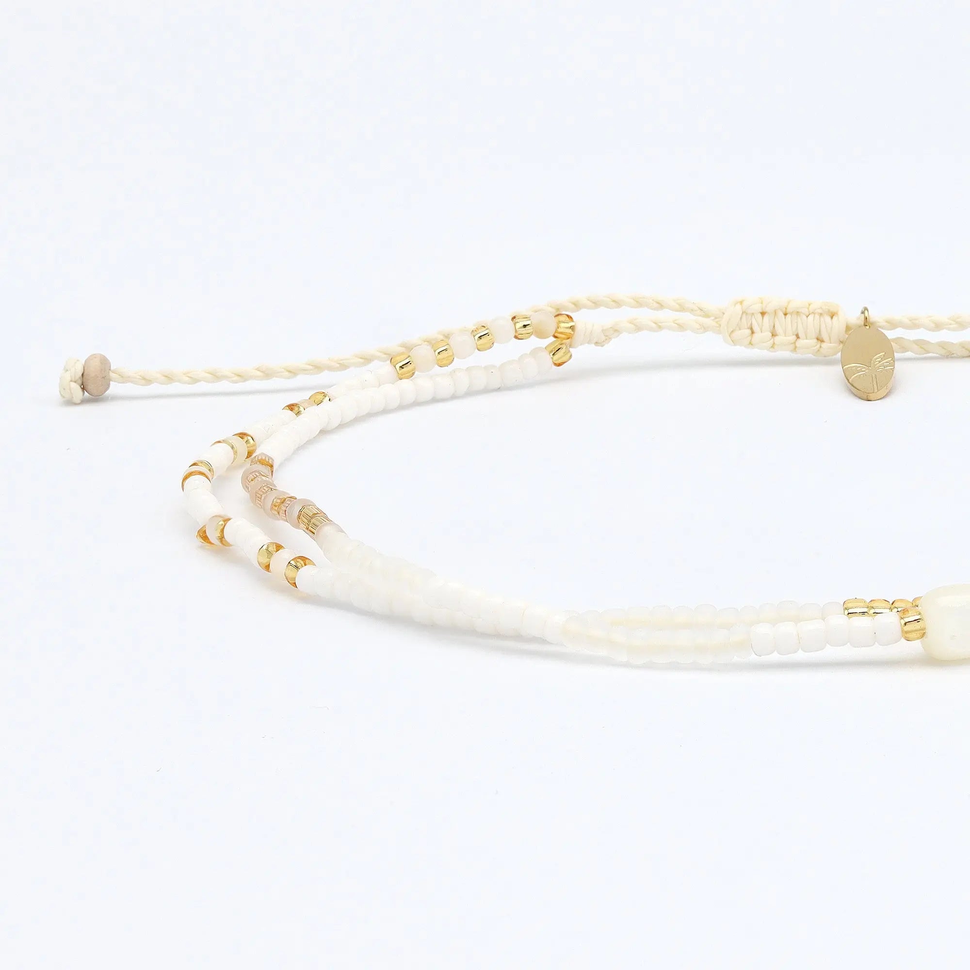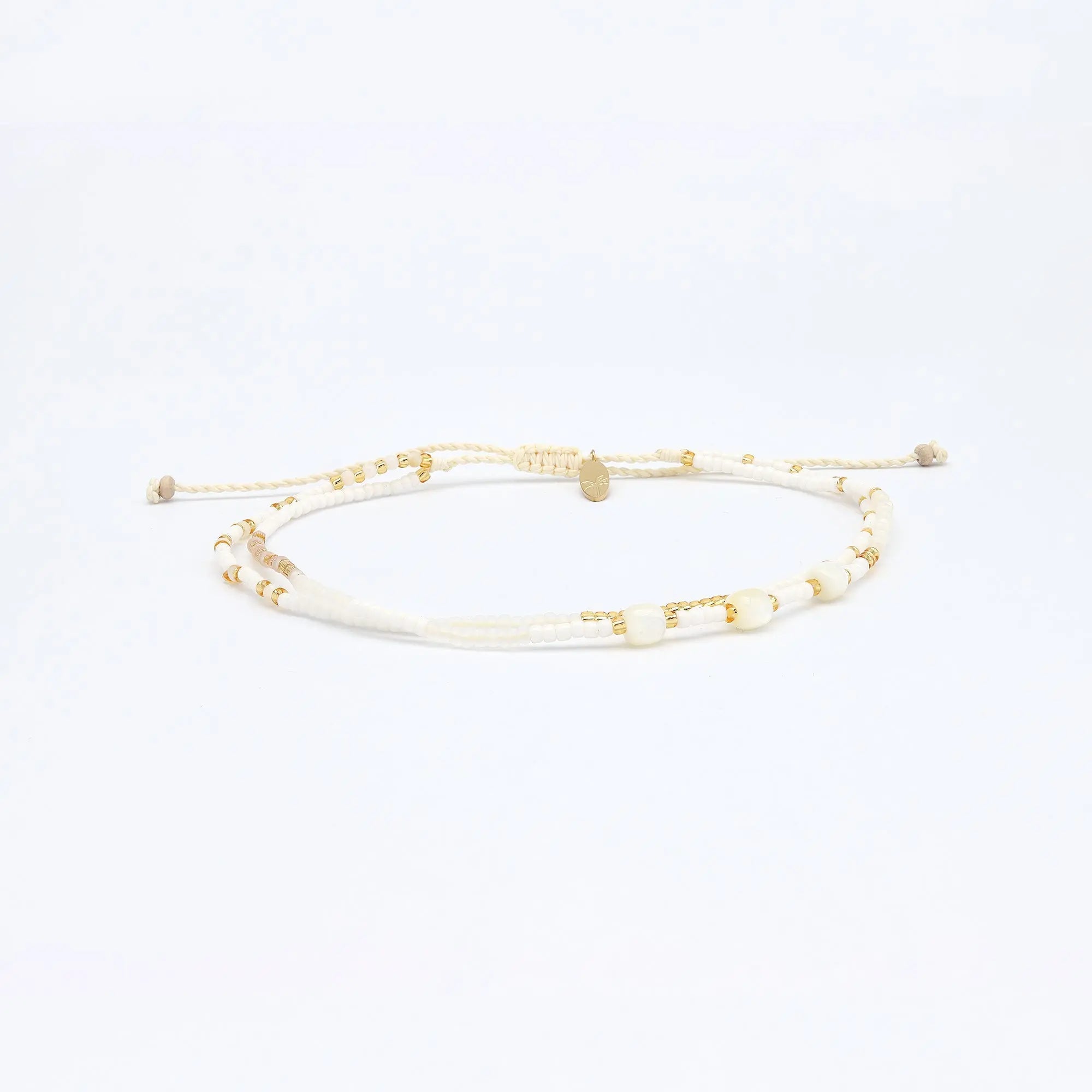 Named after the Indonesian word for sand, the Pasir Anklet brings all the golden hour vibes. With creamy white seed beads, shimmering natural troca shell accents, and a touch of gold sparkle, this double-layered design feels like sunshine on warm coastal sands.