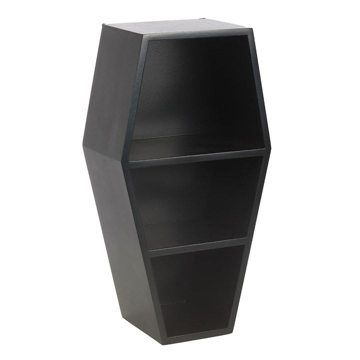 Storage, but make it gothic. This coffin shelf is perfect for displaying trinkets, plants, crystals or your favourite spooky finds. Offered in classic black and designed to be wall mounted or free standing, it is ideal for lovers of all things dark and mysterious. Approximately 40cm tall.