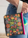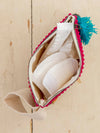 - Features: Wrist strap, zipper closure, pompom trim and stacked tassel zipper pull