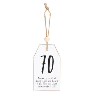 The perfect token gift for family and friends, this white sentiment wooden tag-shaped decoration features the words '70 - You've seen it all, done it all and heard it all. You just can't remember it all!'.