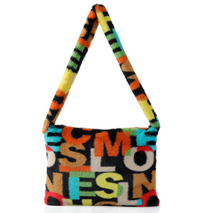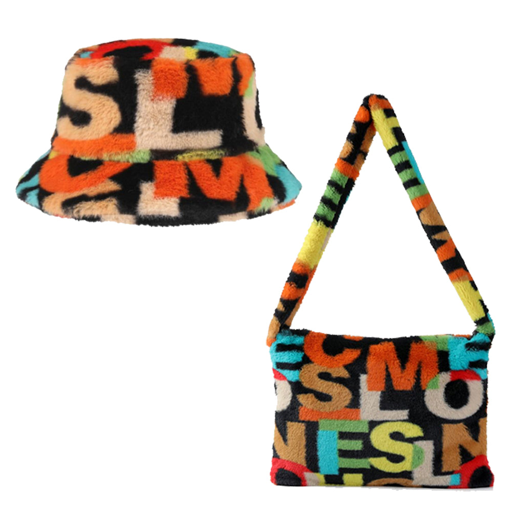 Soft Faux Fur Fluffy Alphabet Print Bucket Hat & Shoulder Bag Bundle -