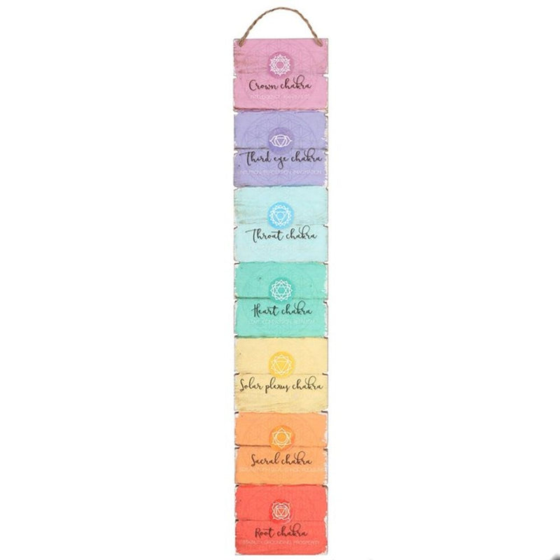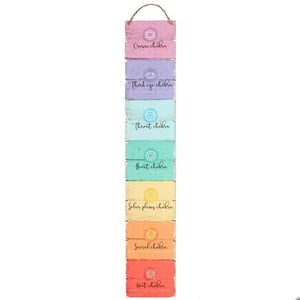 Each chakra is associated with a different colour and a place in the body where the energy gathers. This lovely MDF hanging sign displays each of the seven chakras in order with their colour, symbol and meaning.